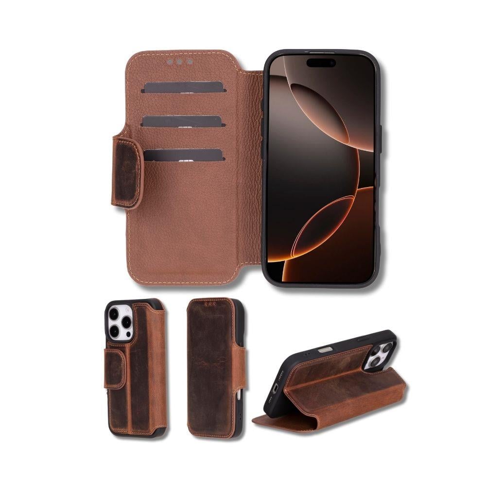 Cep Telefonu Aksesuarları Apple iPhone 16 Pro uyumlu, Hakiki Deri, El Yapımı, Cüzdanlı Kılıf, Antik Kahve Satın Al
