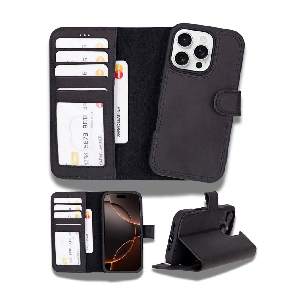 Cep Telefonu Aksesuarları Apple iPhone 16 Pro uyumlu, Hakiki Deri, El Yapımı, Cüzdanlı Kılıf, Mat Siyah Satın Al