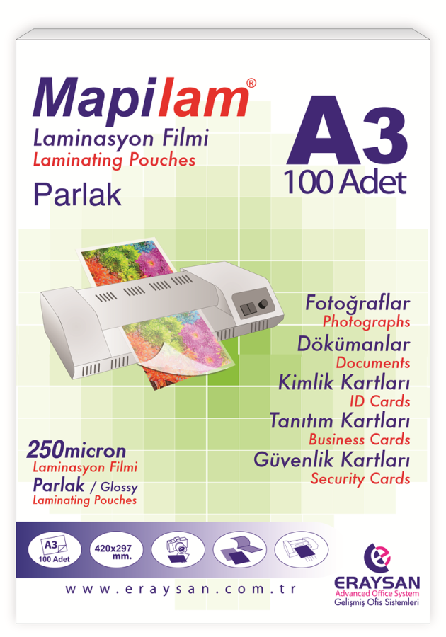 MAPİLAM 250 MİCRON PARLAK LAMİNASYON FİLMİ (A3) 100 LÜ (1022503)