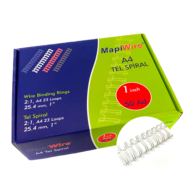 Mapiwire-1" Kutu Tel Beyaz 50 Adet Mapiwire A4 Kutu Tel Spiral Renk             : Beyaz Aralık            : 2:1 Ölçü              : 20,0 mm - 1" Yaprak Adedi  : 180 - 200 (70 gr kağıt) Loop              : 23 Pakette          : 50 adet Mevcut Renkler: Opak Renkler    : Beyaz, Siyah, Kırmızı, Lacivert, Sarı, Yeşil, Gri, Bronz Metalik Renkler: Kırmızı, Sarı, Yeşil, Mavi, Gümüş